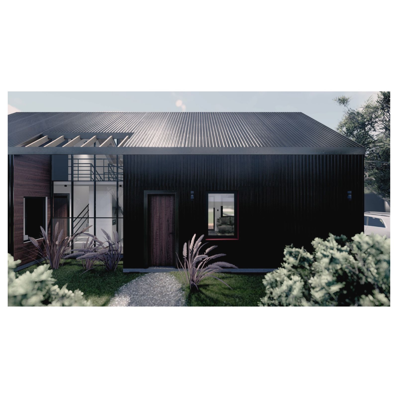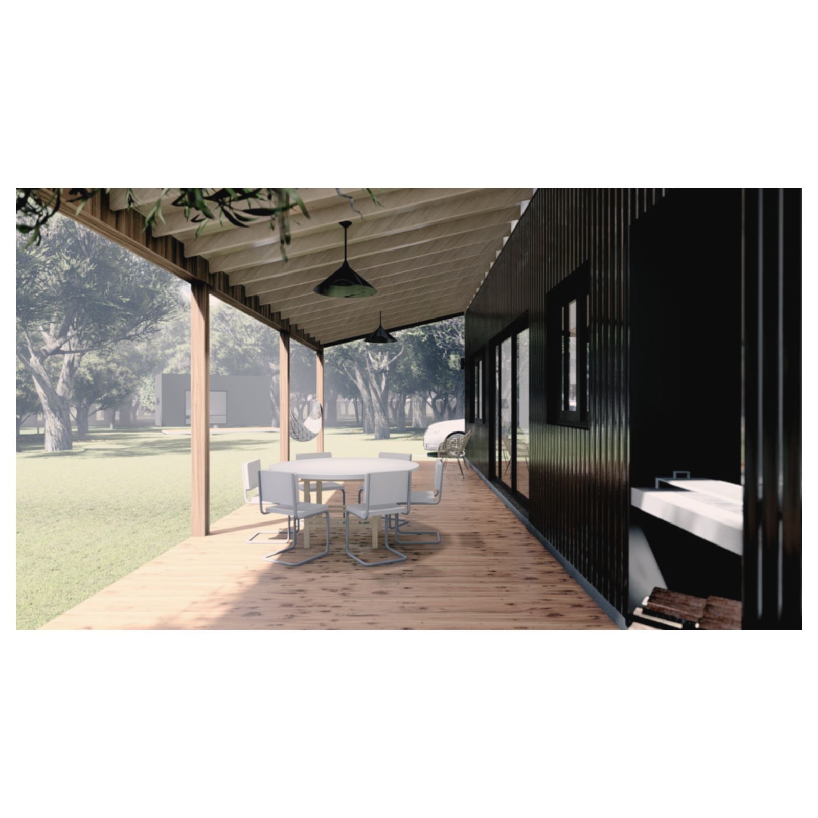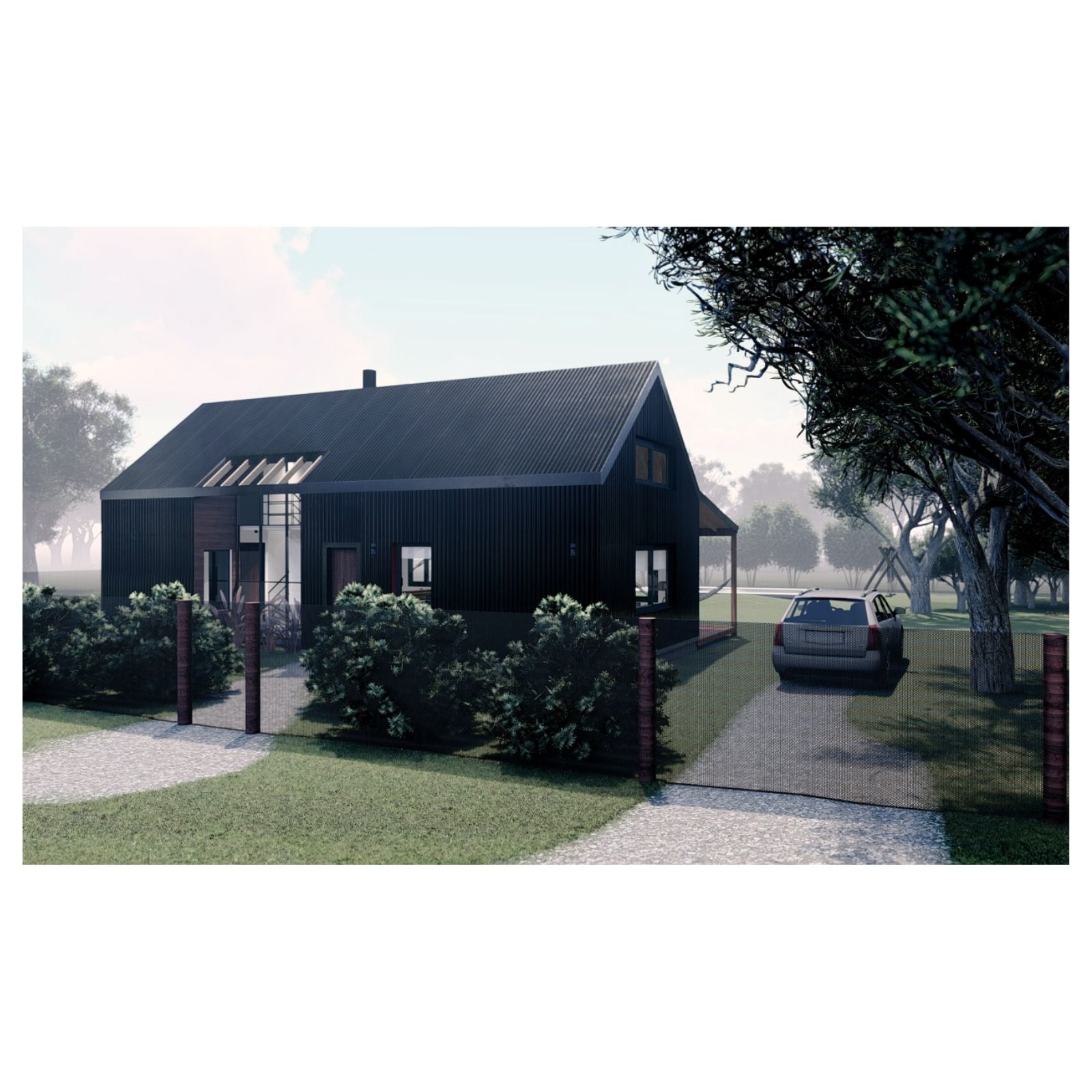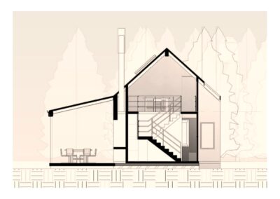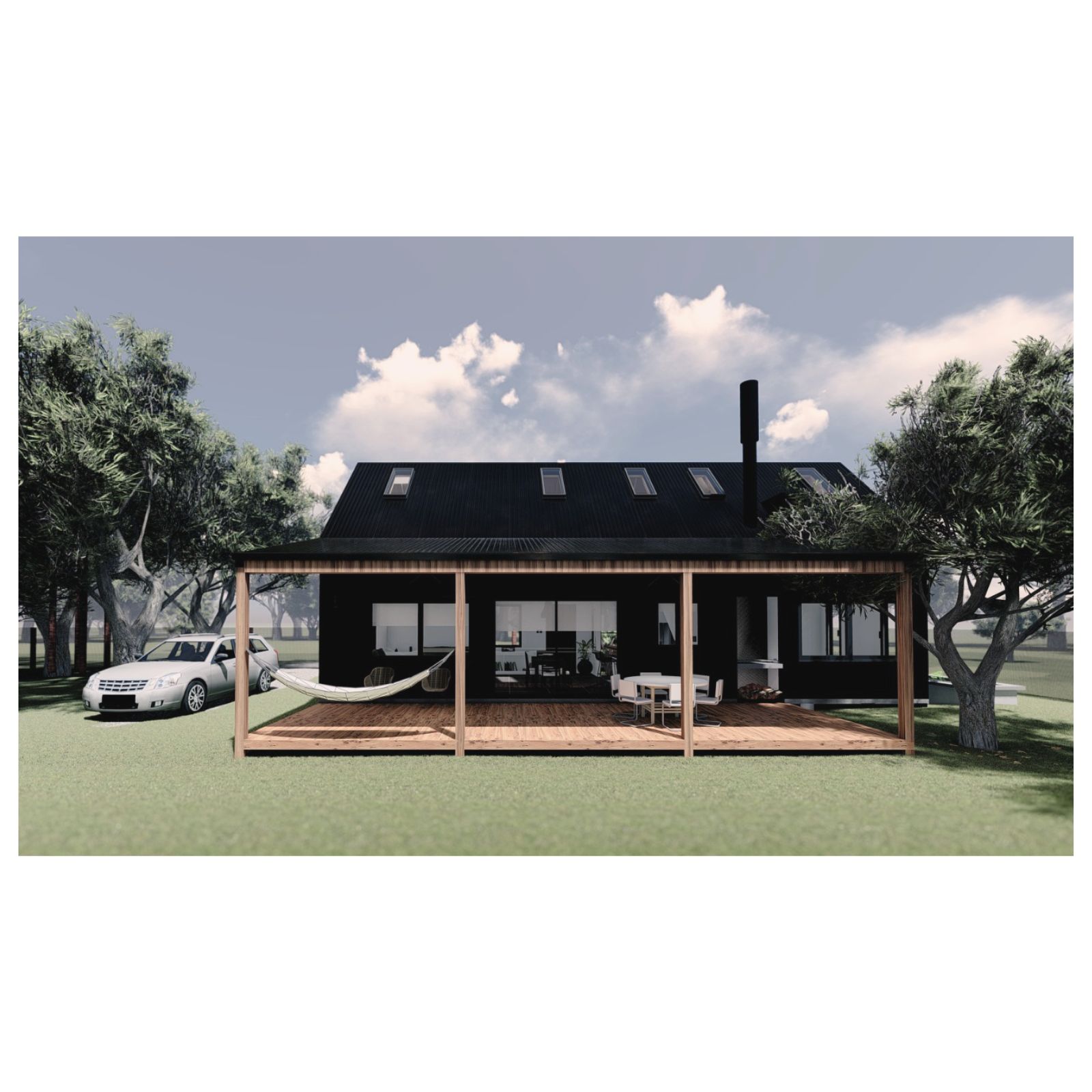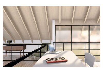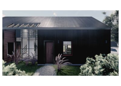 Desde el exterior se ve un prisma con una gran cubierta a dos aguas, construida en madera y revestida en chapa, la cual ahuecamos con una gran carpintería transparente, que funciona como separador entre lo público y lo privado y permite junto a una batería de claraboyas la entrada de luz en toda la casa. Desde el interior del terreno, una enorme galería protege del sol de tarde y permite la conexión con el parque.