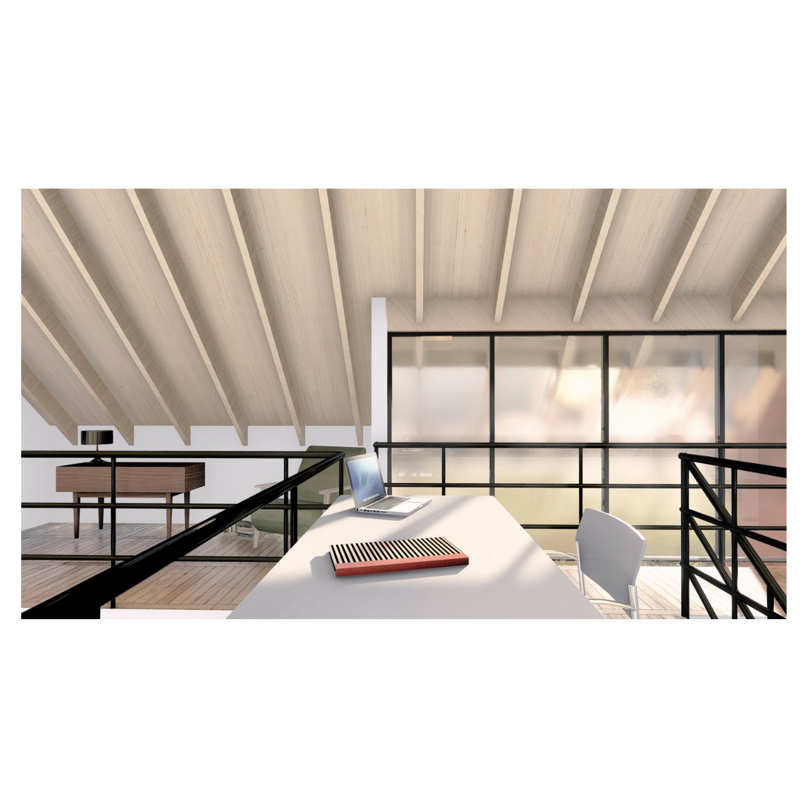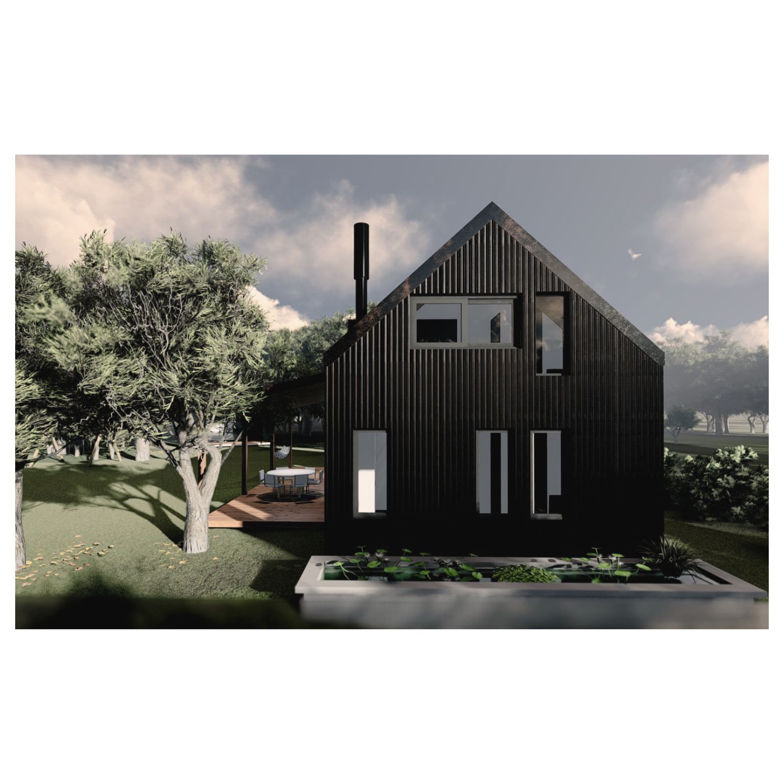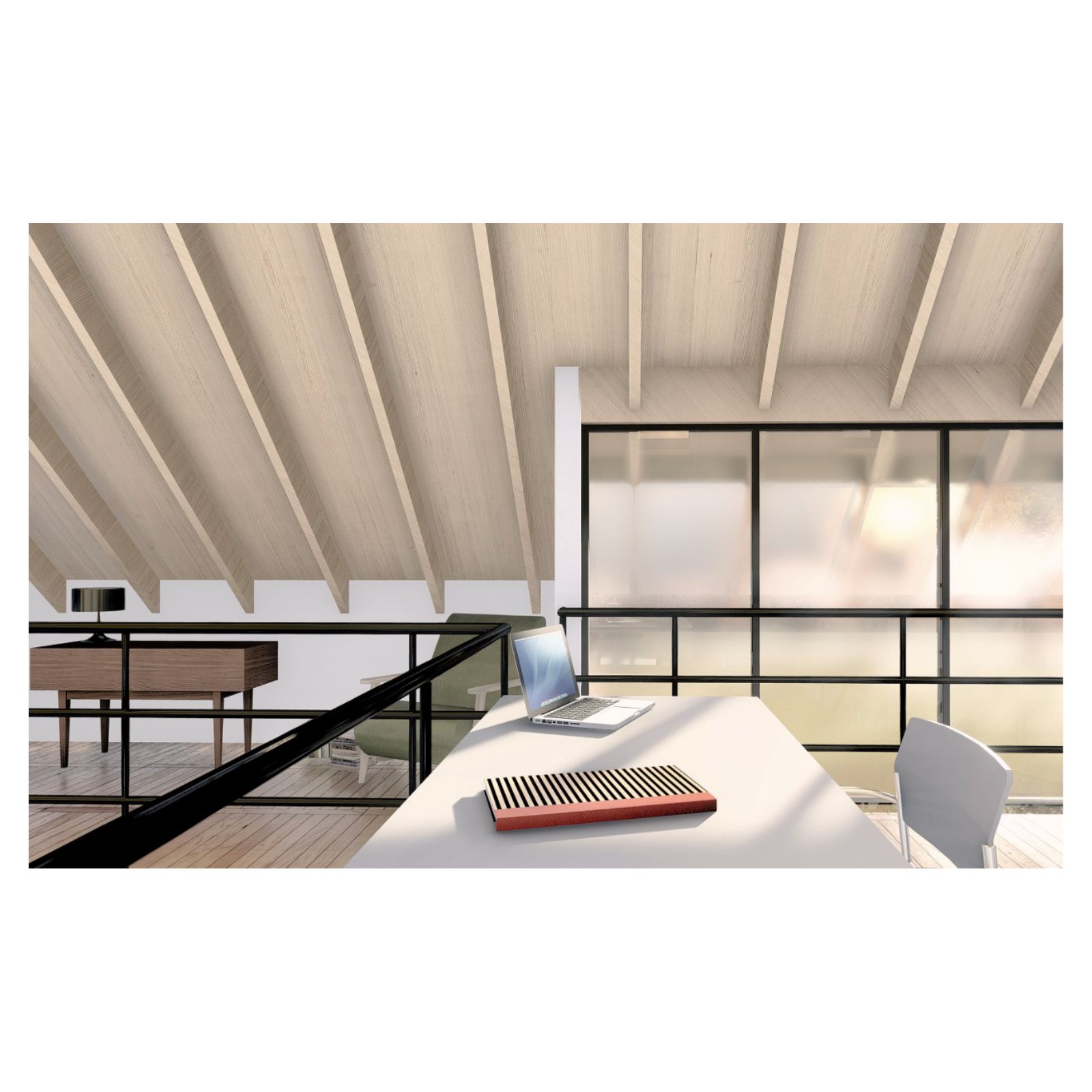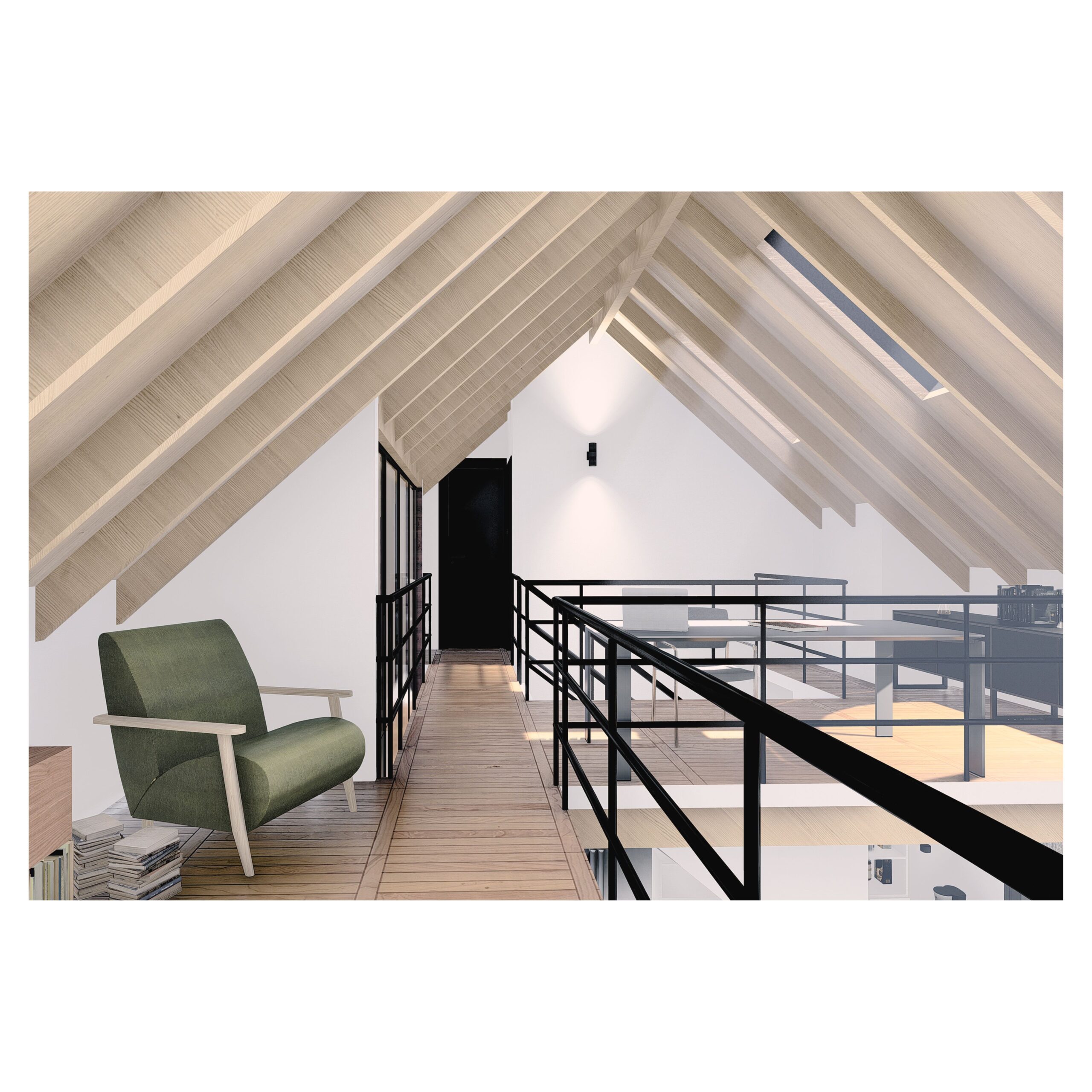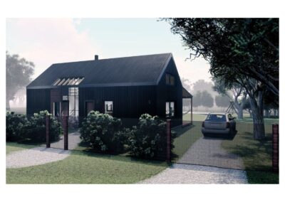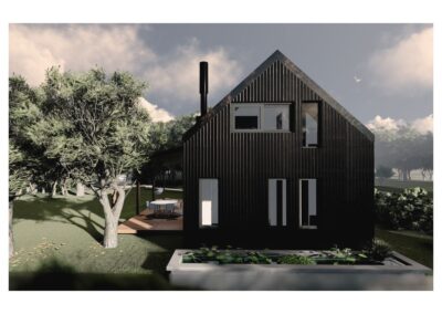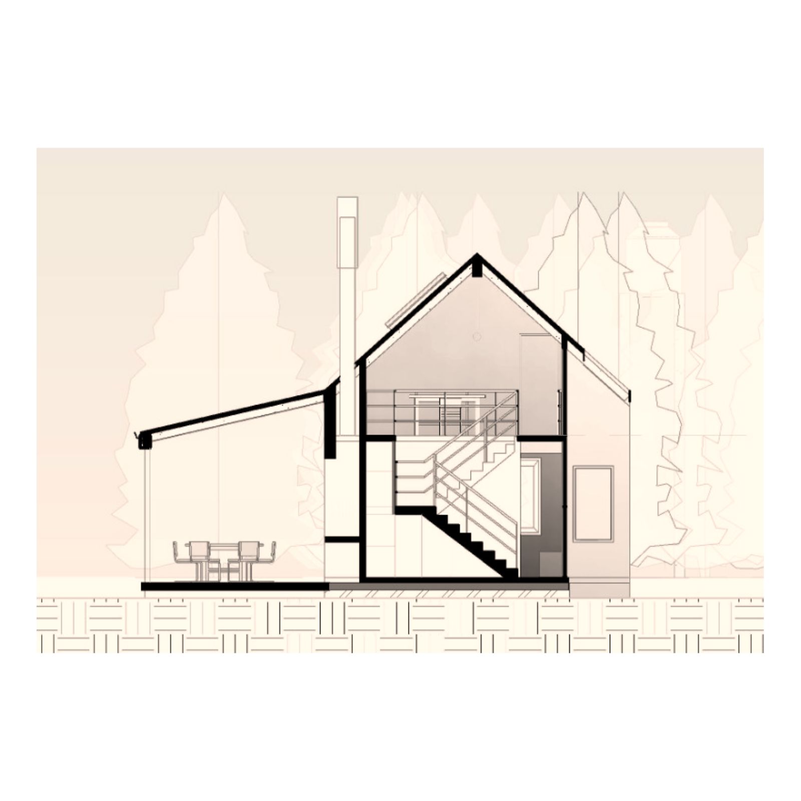 Desde el exterior se ve un prisma con una gran cubierta a dos aguas, construida en madera y revestida en chapa, la cual ahuecamos con una gran carpintería transparente, que funciona como separador entre lo público y lo privado y permite junto a una batería de claraboyas la entrada de luz en toda la casa. Desde el interior del terreno, una enorme galería protege del sol de tarde y permite la conexión con el parque.