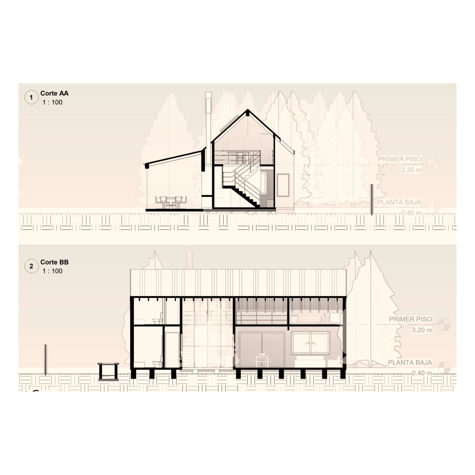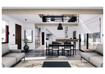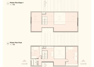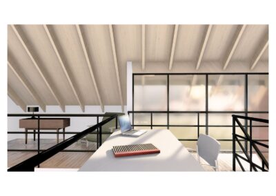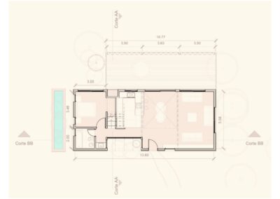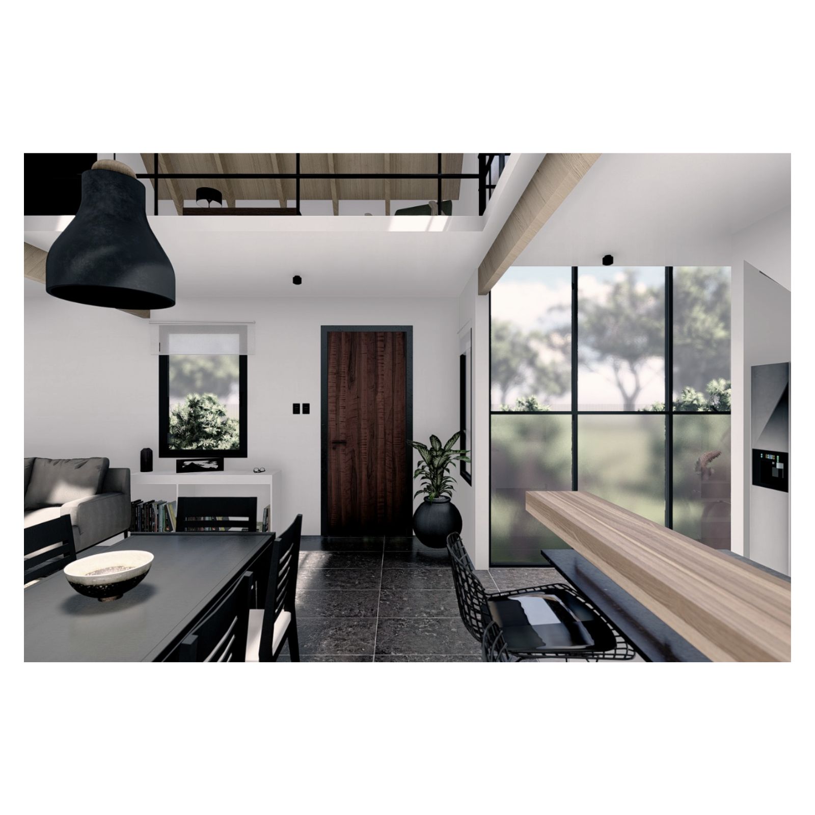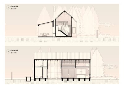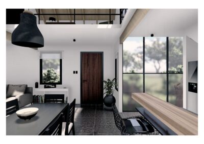 Al entrar a la casa hay un gran estar con visuales al monte existente, un comedor en doble altura vinculado a la cocina y la galería, y una habitación que permite habitar la casa en un sólo nivel cuando fuera necesario. En el gran entrepiso planificamos para una segunda etapa armar dos habitaciones, un escritorio y un baño.