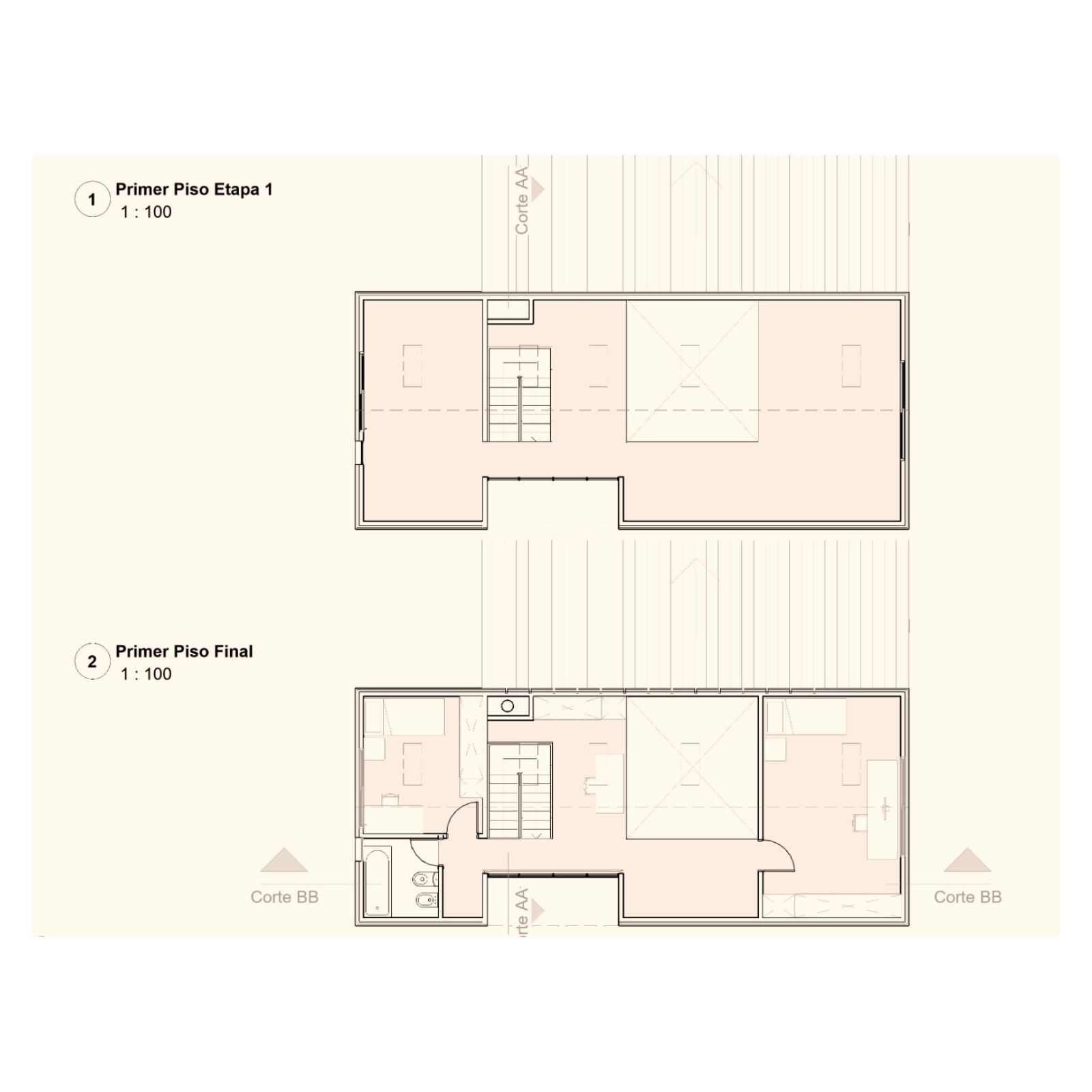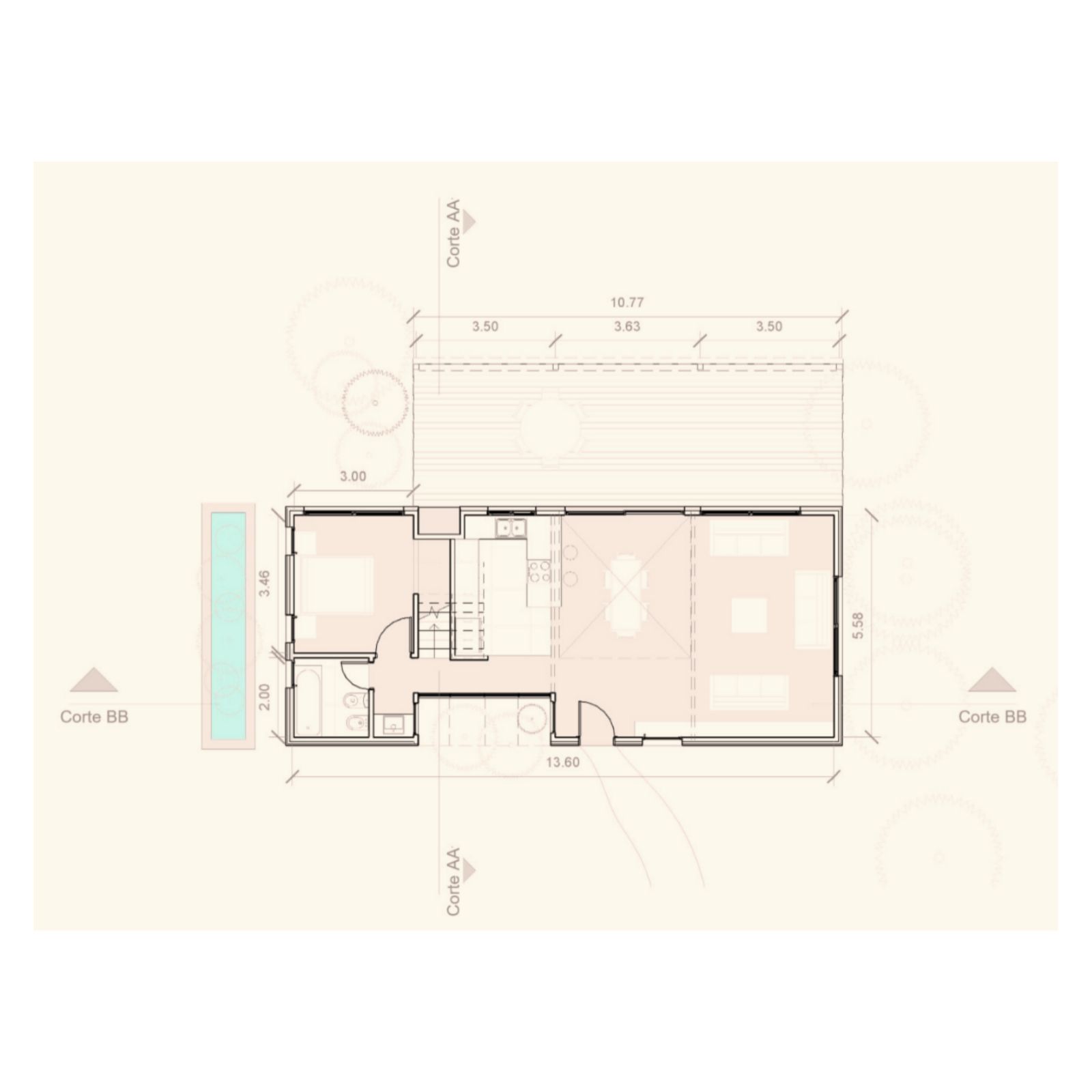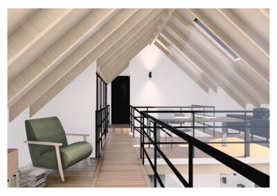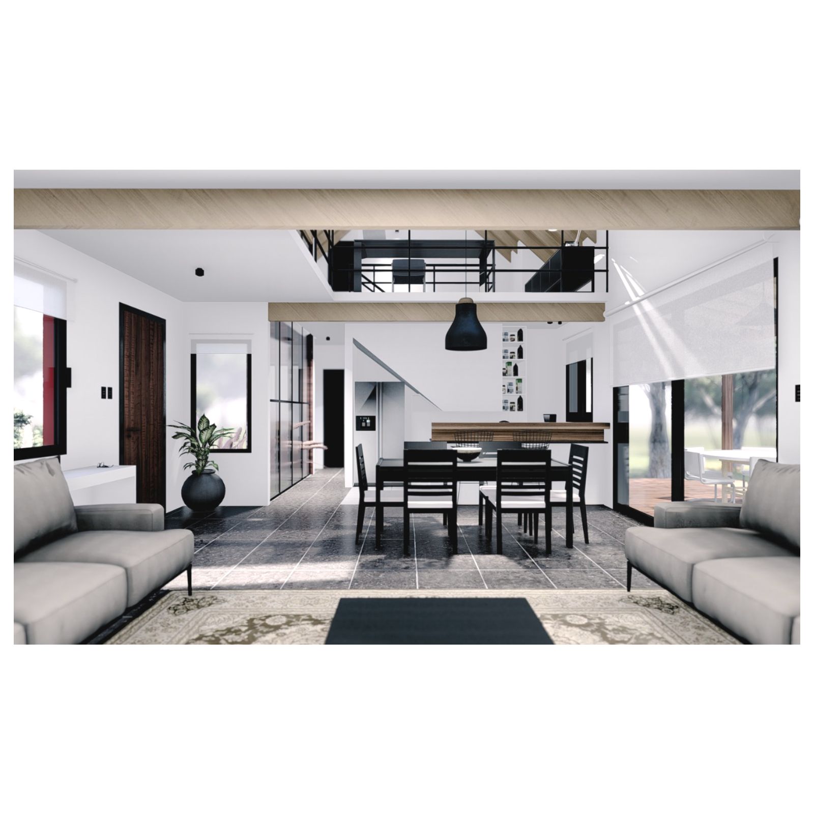 Al entrar a la casa hay un gran estar con visuales al monte existente, un comedor en doble altura vinculado a la cocina y la galería, y una habitación que permite habitar la casa en un sólo nivel cuando fuera necesario. En el gran entrepiso planificamos para una segunda etapa armar dos habitaciones, un escritorio y un baño.